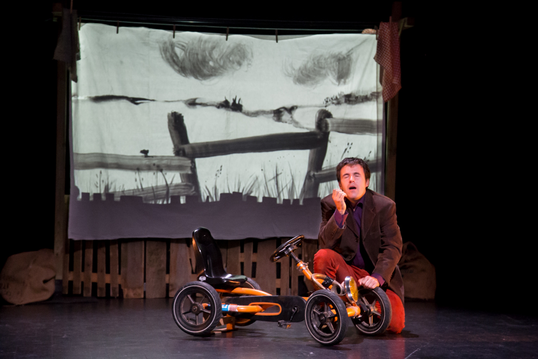 Un road movie en kart à pédales ? Ou si vous préférez : un spectacle illustré en direct, une pièce de théâtre, un conte musical… joué par La Famille PetitPlus. L'histoire : toute la journée, Ujène tourne en rond sur sa charrette à pédales. Il tourne en rond autour de sa maman qui le protège et qui sent si bon. Il est bien ici, mais dans le rêve qu'il fait souvent il pédale de l'autre côté de la barrière et il s'en va jusqu'au Grand Talus et ça c'est défendu ! Parce que les gens sont comme-ci, les maisons comme ça et qu'les pommes là-bas, y en a pas …